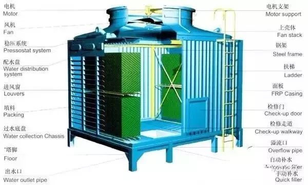 上述各種部件的不同組合,構成各種形式和用途的冷卻塔:開放點滴式冷卻塔、風筒式自然通風冷卻塔、抽風(或鼓風)逆流式冷卻塔、抽風橫流式冷卻塔等。